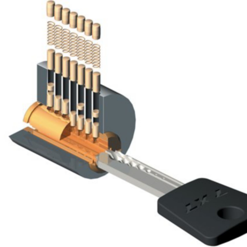 - Двойная альфа-пружина — уникальный подвижный элемент на кончике лезвия ключа, который соединяется с уникальным штифтом, создавая дополнительную линию сдвига.